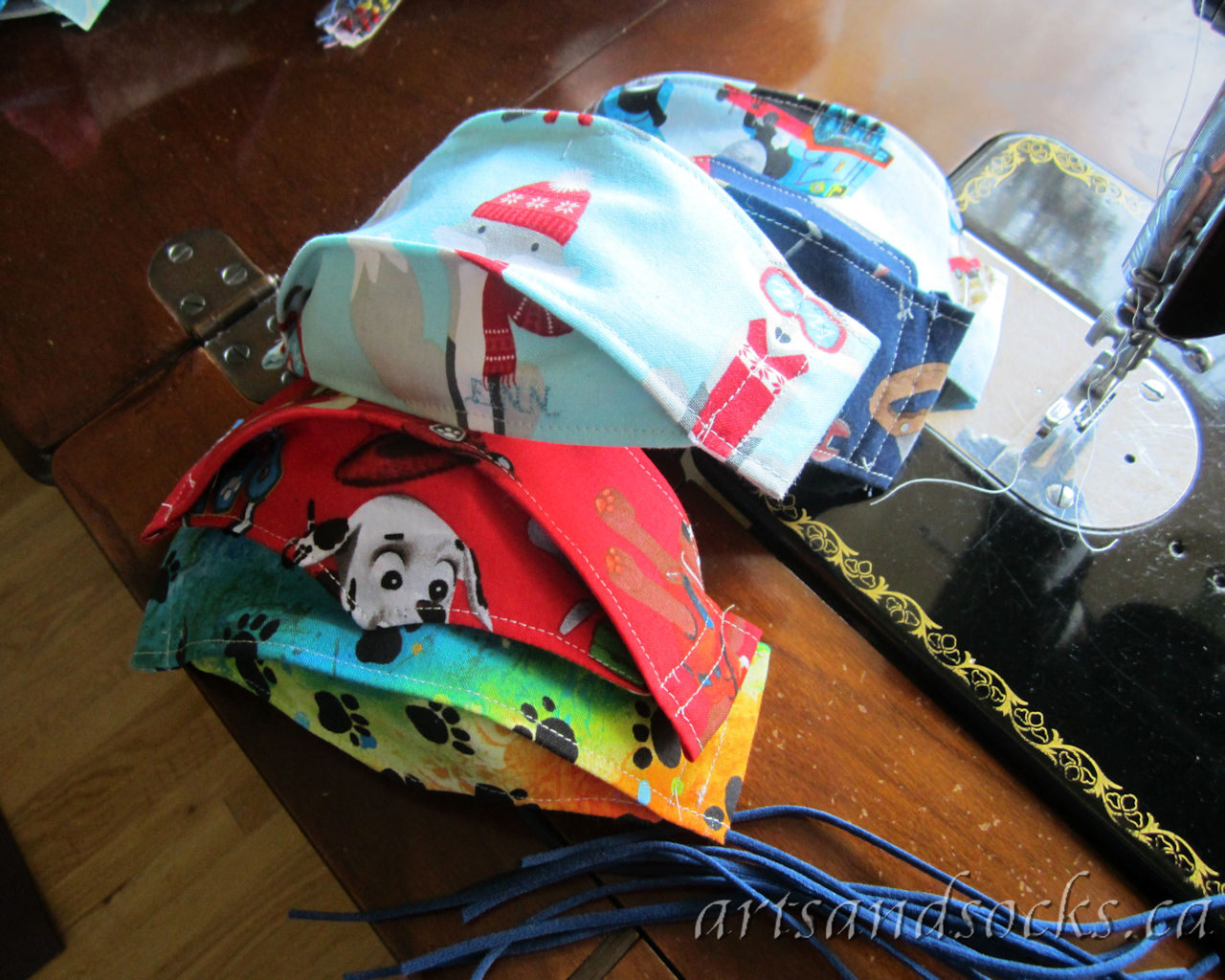 These still need their elastic. Next up, we will need Christmas ones! I just looked in my Christmas bin, and I think I have lots of potential fabric.